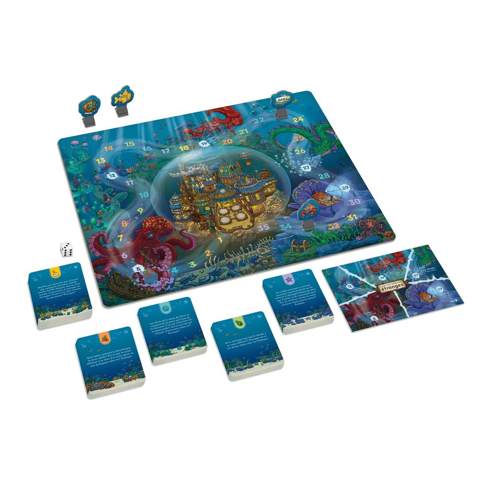 Contents: 1 game board with 9 puzzle pieces, 108 question cards, 1 "Strange Creature Cases" sheet, 4 submarine counters, 1 die, 1 accompanying guide, game rules.