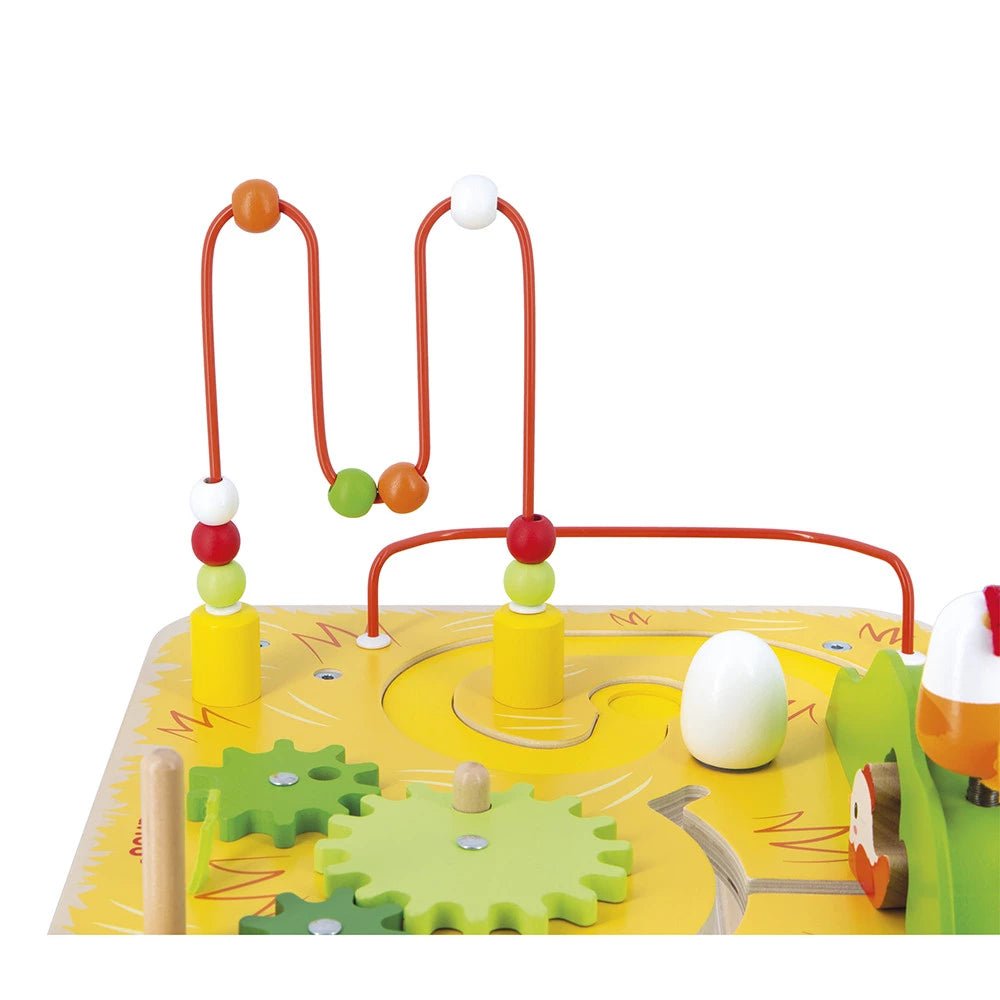 Come on, let's introduce your child to new games with this ultra-complete wooden activity table featuring 7 of them: 1 circuit where a spring-loaded chick pushes a wooden ball down a hill, 1 looping bead circuit with 9 wooden balls to slide around, 3 gears with 1 removable bunny , 1 stackable carrot, 1 potato and 1 tomato to fit in, 1 maze with another chick running to hide under the hill, and 1 rotating sound egg.